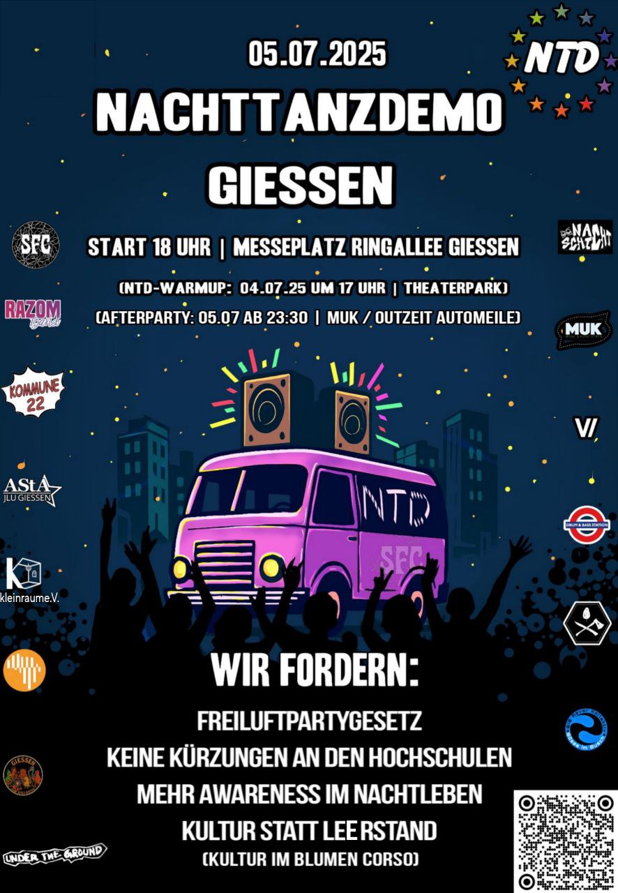 đ Am Samstag (5. Juli) startet dann wie gewohnt um 18 Uhr am Messeplatz die Nachttanzdemo und zieht mit elf Wagen durch zentrale StraĂen und PlĂ€tze der Stadt, wie zB Kennedyplatz, Oswaldsgarten und Selterstor. Die Demo endet gegen Mitternacht mit Kundgebungen und RedebeitrĂ€gen vor dem Theater.